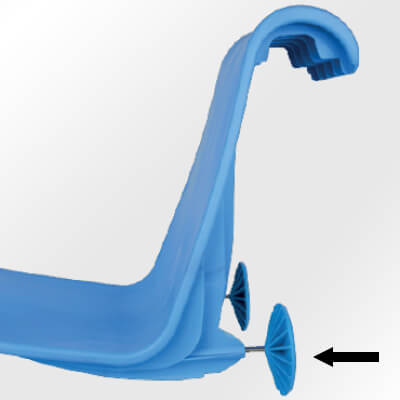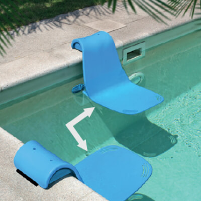 Passo 6: a cadeira já está pendente sobre a água. Certifique-se de que as pernas fiquem bem apoiadas na parede da piscina. Pode ajustá-las rodando-as até determinar a posição correta.